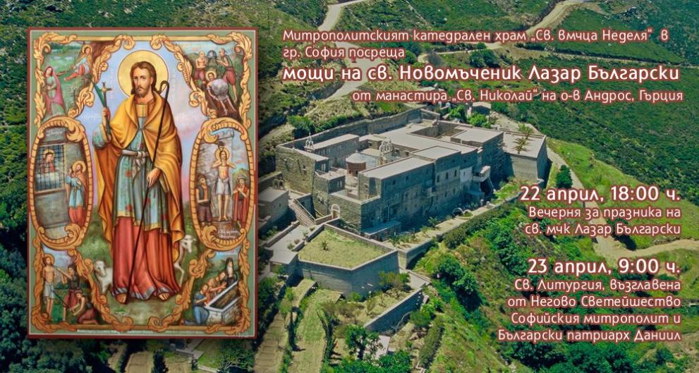 Частица от мощите на св. новомъченик Лазар Български ще бъде донесена в София за поклонение на 22 април, съобщават от Софийската митрополия. Светинята ще бъде изложена в митрополитския катедрален храм „Св. великомъченица Неделя“ на 22 и 23 април.