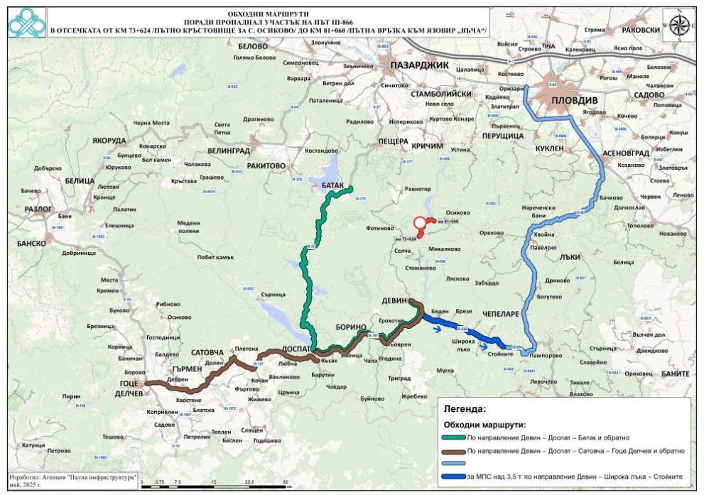 Леките коли се пренасочват по обходен маршрут през прохода Шипка. Тежкотоварните камиони остават на място и изчакват, докато превозното средство бъде изтеглено от пътното платно и трафикът бъде възстановен.