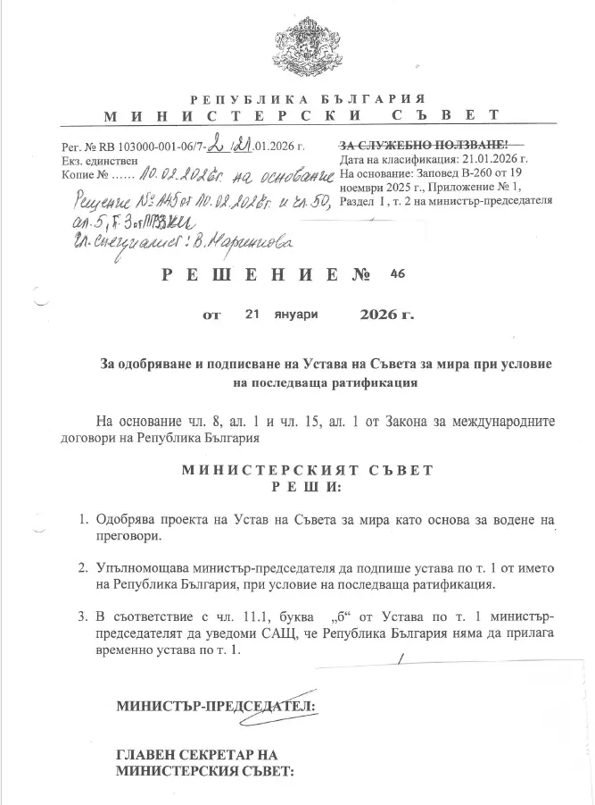 От Министерския съвет допълват, че временно е депозирана нотификация, според която до ратификация уставът на Съвета за мир няма да се прилага, а страната ни може да участва единствено с право на съвещателен глас. С подписването на документа България получава възможност да бъде сред учредителите на Съвета за мир, като окончателното институционално утвърждаване на това участие ще зависи от решенията на бъдещото Народно събрание след предсрочните парламентарни избори и от формирането на ново правителство с нова легитимност.