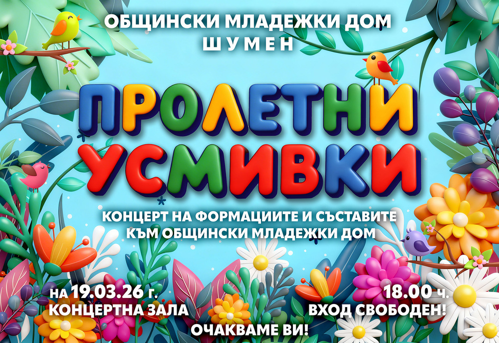 Шумен ще посрещне астрономическата пролет с пъстър и вдъхновяващ концерт. На 19 март сцената на Общинския младежки дом ще оживее с проявата „Пролетни усмивки“, в която участие ще вземат формации към институцията. Събитието е с вход свободен и е посветено както на настъпващата пролет, така и на празничния месец март.